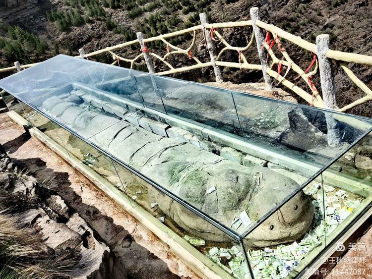 第三处是“巨蛇观岛”。当地村民开山取石时发现了一块巨石,形态酷似大蛇,横卧于悬崖,眺望着“在河之洲”定情岛。这条胖胖的石蛇被精心保护在玻璃罩内。