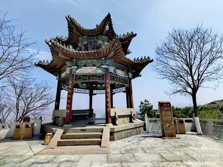 先到了乾坤亭。此亭以八卦为形, 地下是用大石铺成的阴阳太极图, 与山下的乾坤湾相呼应,寓意“镇定乾坤”。亭柱两侧刻“天地造化乾坤湾,羲皇推演太极图”,记述了先祖伏羲在乾坤湾仰观天象,发明了太极八卦阴阳学理论的史实。