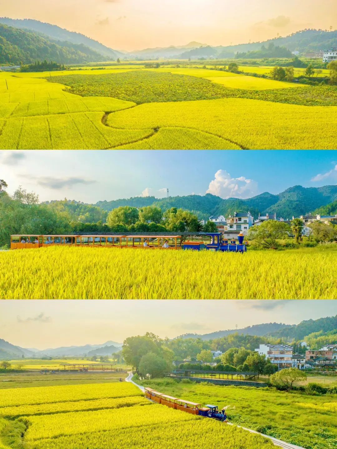 金色的稻田,和黛瓦粉墙的婺源搭配起来,是初秋婺源的第一抹风景,稻花香里说丰年,周杰伦歌词里的稻香,还有稻田里的小火车,都超级治愈