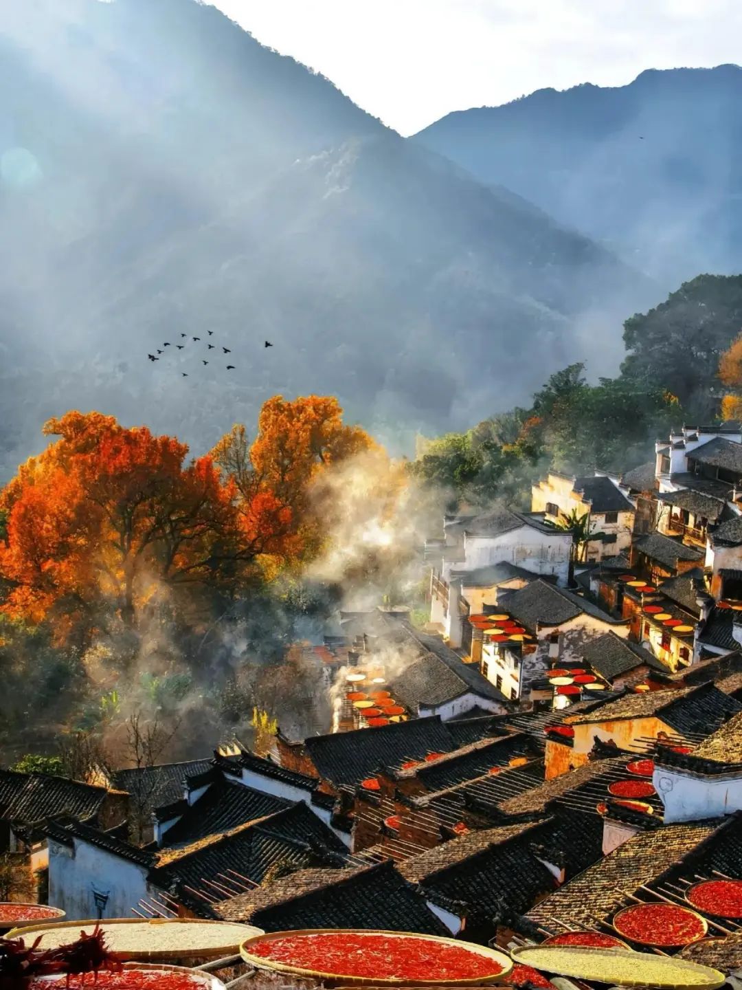 婺源红枫在11月左右开始进入观赏期,最佳在11月中旬左右,红枫+晒秋+晨雾,是每年婺源秋季最美的时候,人间烟火,白云深处有人家都在这一刻具象化