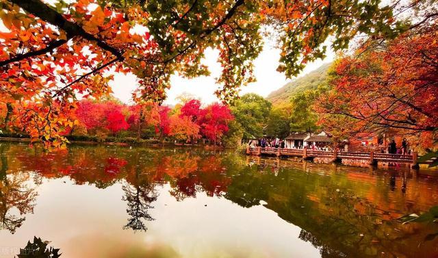 深山踏红叶,耳畔闻鸟鸣。栖霞山号称金陵第一明秀山,每年枫叶红时,雾影朦胧。深秋红枫层林尽染,古刹栖霞寺梵音缭绕。栖霞枫叶有50多种,不同的“红”组成栖霞山的秋日主色调。