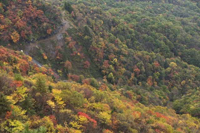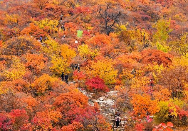 北京赏秋的地方很多,喇叭沟、雾灵山、香山等,房山区的坡峰岭胜在红叶面积大。一眼看上去满目都是红的,并且是连片的红。10月下旬,坡峰岭的红叶是从山顶开始变红,之后的20天里向山脚蔓延。远远望去整片山都是红的。