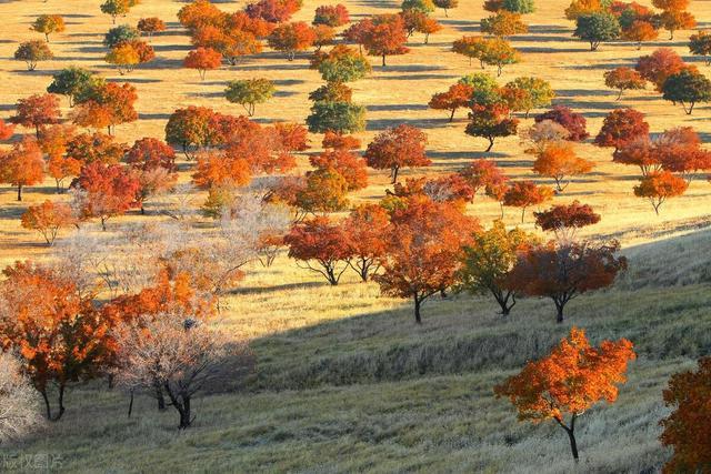 代钦塔拉五角枫林位于内蒙古科尔沁右翼中旗,五角枫树孤傲特立的生长在辽阔的大草原上,棵距稀疏,错落自由,每棵树都尽情舒展。十月中旬是枫叶开得最红的时候,漫山遍野红的很惊艳,最佳观赏期仅有两周。代钦塔拉五角枫