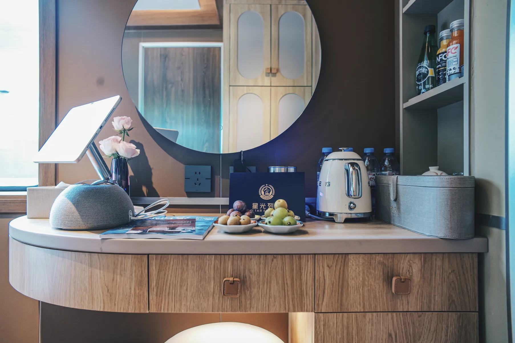 梳妆台上满满当当的,有鲜花、《旅行家杂志》、欢迎水果、加湿器、烧水壶、茶具,还有依云水,常温的饮料、小罐茶。