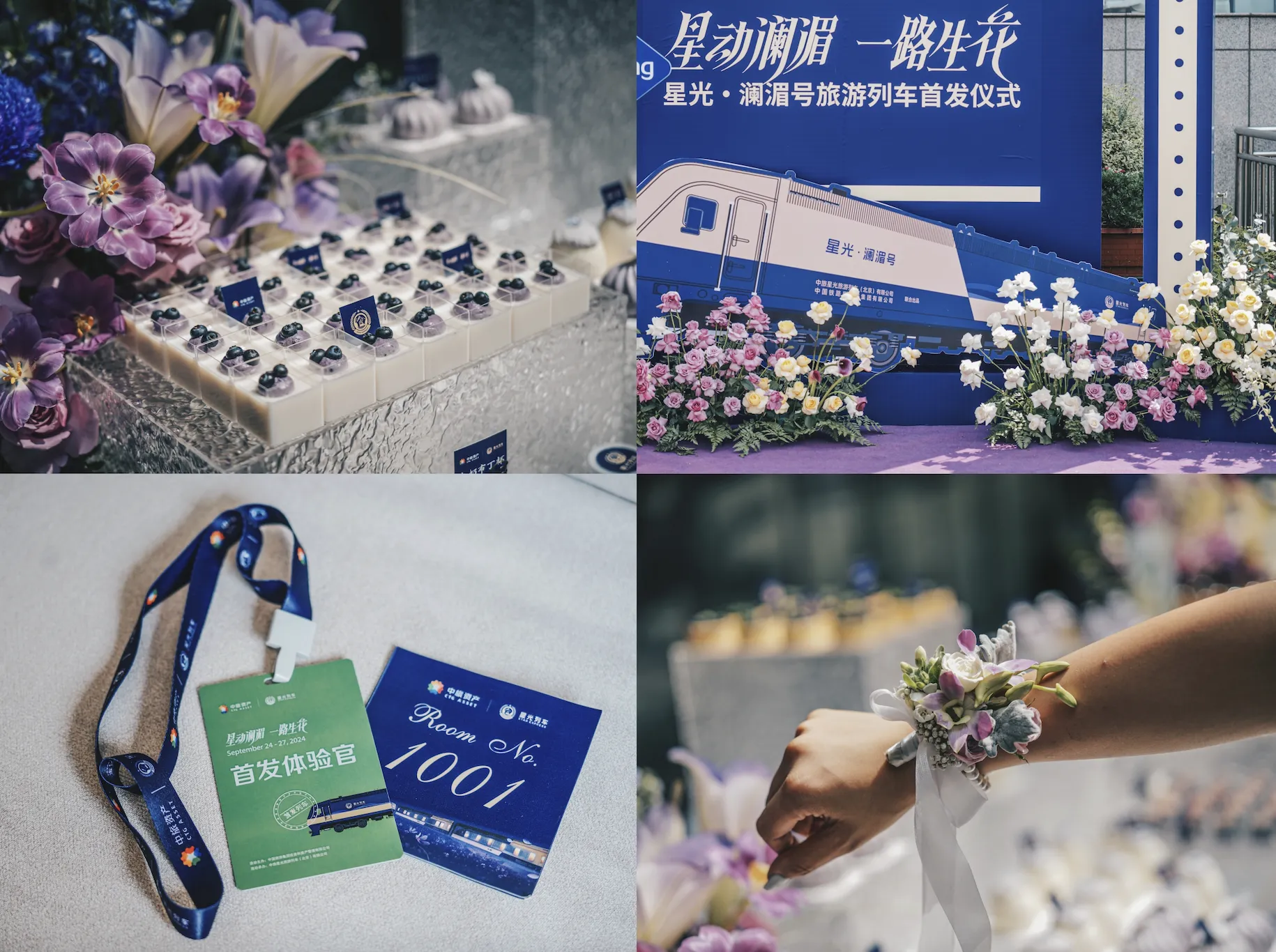 上车前的体验感就已经拉满,昆明站就有星光列车的休息室,小甜点都和澜湄号玩起了谐音梗,都是蓝莓系。