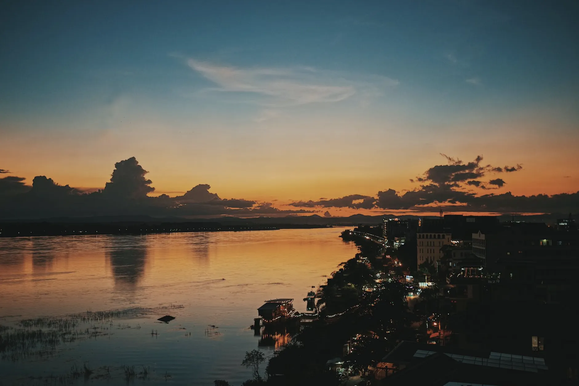 晚上是一家可以看双国落日的法餐厅,位于湄公河畔,河对岸就是泰国。