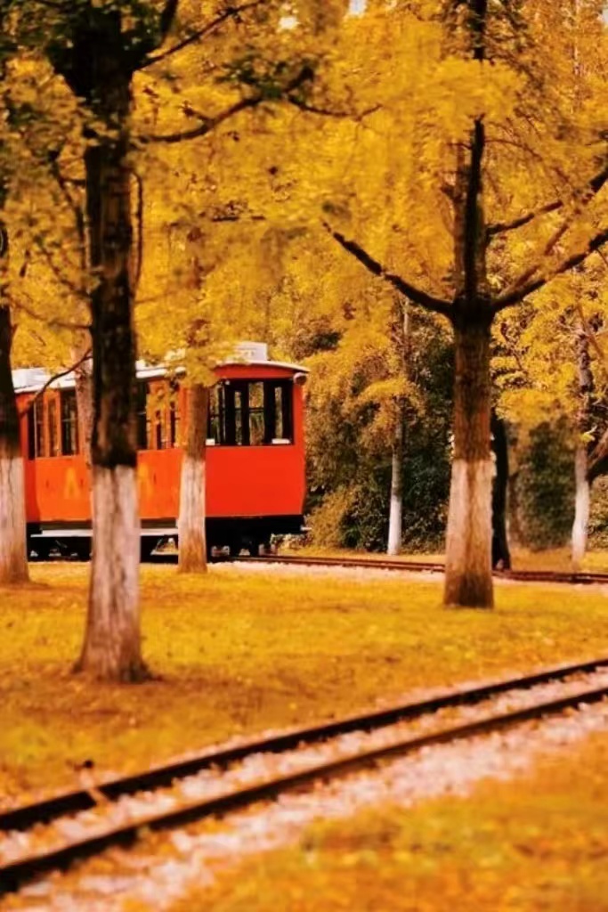 这里还有一班开往秋日的童话小火车,坐在车上,地驶向银杏林的深处,看窗外落叶簌簌而下,就像是闯入了美丽的童话故事。