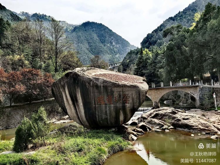 这块大石头人们称之为 “璜石”,俗称丢石,又名钓璜灵矶,上巨下锐,似倒锥状屹立在溪水之中,被誉为宝鸡外八景之一。相传此石是女娲娘娘补天时遗落的五彩石。姜子牙在此隐居垂钓时,从鱼肚剖出来一颗小石子随手一扔,没想到这颗小石子经姜子牙之手后见风就长,眨眼功夫就长大了。姜子牙年届七十却一事无成,来此隐居十余载,被周文王访贤才得以转运,璜石又经姜子牙之手,后人将此石作为“转运石”,游客们也就纷纷把自己的愿望写在小石子上掷上巨石以求转运了。