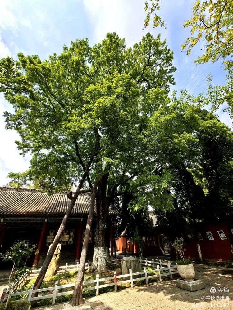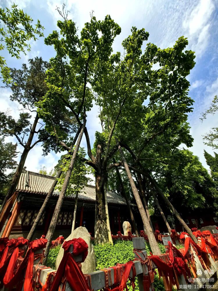 这棵旱莲被证实为世界稀有花树,树龄已达400余年。栏杆上系着红绸子和祈福的红牌子。