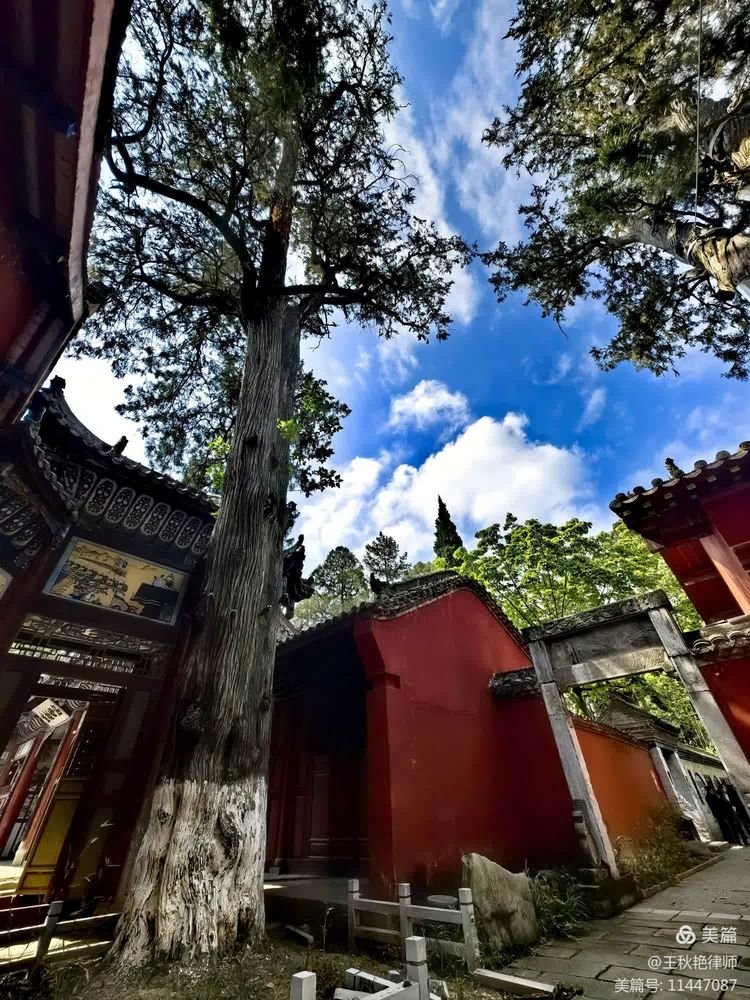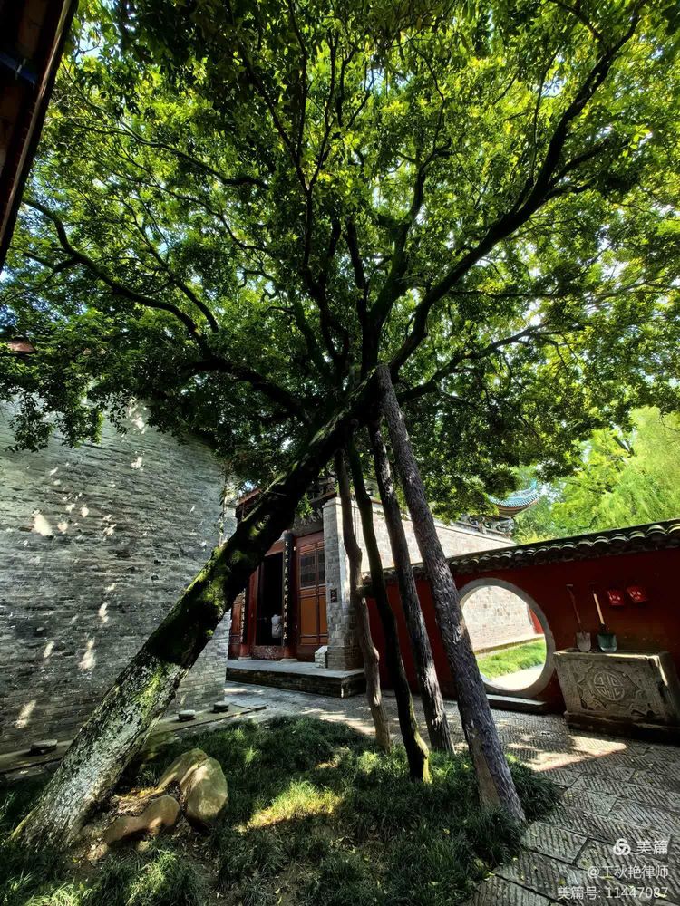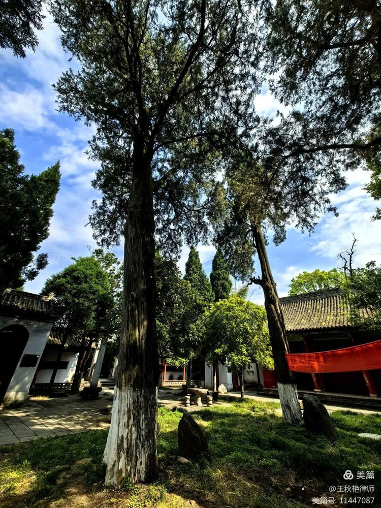 武侯祠内树木繁多,蓊蓊郁郁,满目翠色。今天的天气也好,天空湛蓝,白云悠游。配上红的墙,古朴的建筑,显得益发清幽古朴起来。