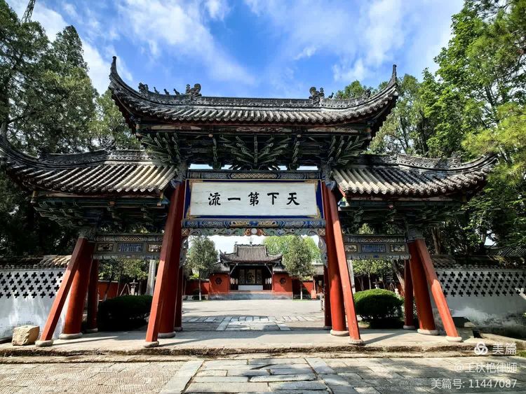 祠前牌坊很大气,建于1591年(明万历十九年),清雍正十三年(1735)果亲王维修,是武侯祠标志性建筑。高10米,八角起翘,牌坊中宽6米,东西两侧各宽3米,四柱落地,上盖灰瓦,坊上一面金书大字“汉丞相诸葛武乡忠武侯祠”,一面书“天下第一流”五个大字。