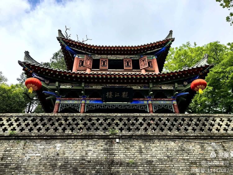 观江楼是最高处,始建年代不样,1803年(清嘉庆八年)重修,是历朝历代人们来祠观瞻、拜谒诸葛亮时登楼观江的处所。登上观江楼,可以回看武候祠全貌,还可以俯视诸葛古镇。