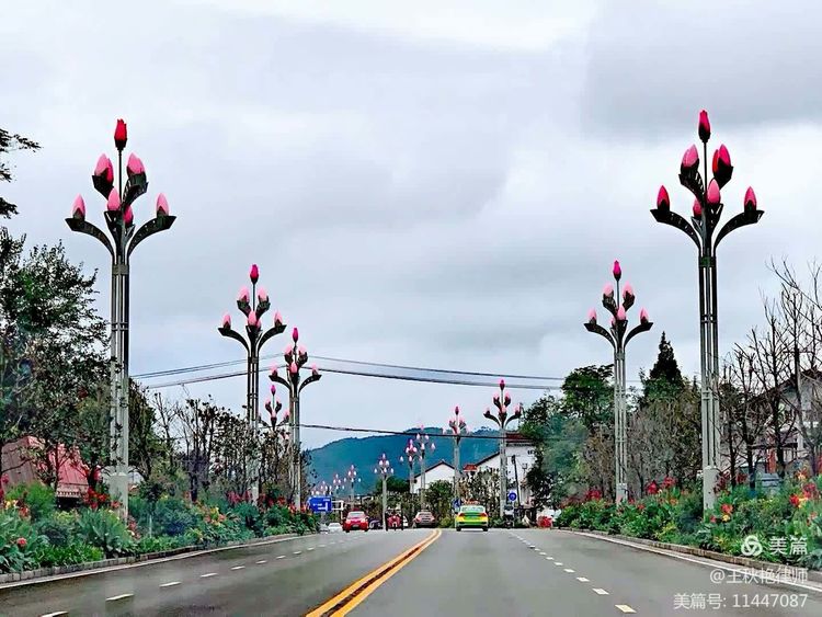 看景区内展出的照片,旱莲的花与粉色玉兰花非常相像。旱莲是汉中市的市花,武侯祠外景观大道两侧安装的是粉嘟嘟的路灯,其形状就是旱莲的花苞。