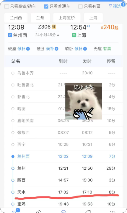 这个时间大家注意看途径地,比如兰州-上海会经过天水,而同趟车天水的出发时间是17点多,相当于空出一个白天。