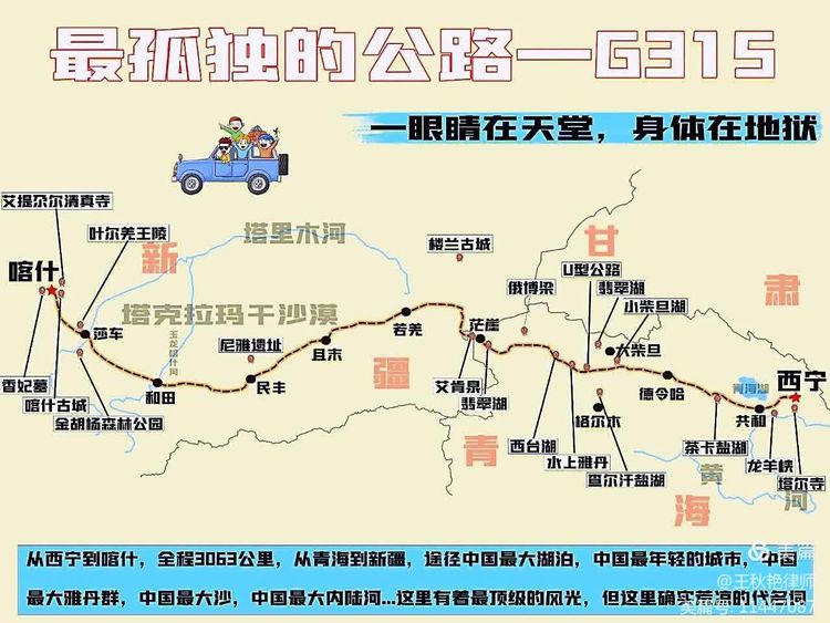 G315起点为青海西宁湟源县,终点为新疆喀什吐尔尕(gǎ)特口岸,是一条东西走向的国道,全长3135公里。其间穿越了柴达木盆地、罗布泊无人区,翻越阿尔金山,横穿塔克拉玛干沙漠,被誉为“中国最孤独公路”,被评为《中国国家地理》“绿洲荒漠区域最美公路第一名”。