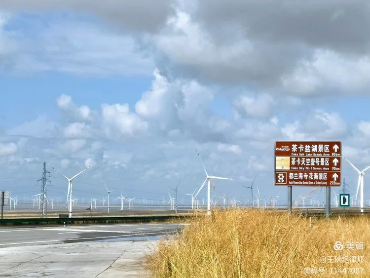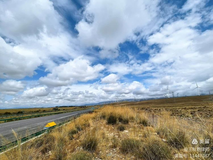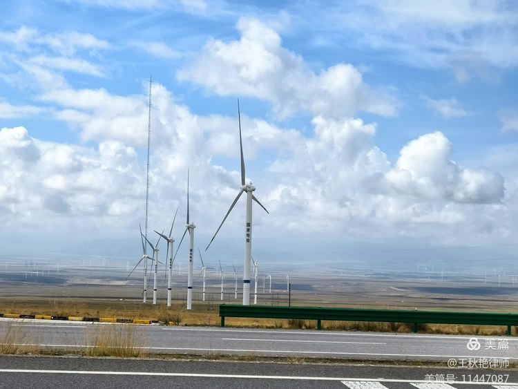 一排排的大风车,伸展着长长的手臂,在风中懒洋洋地晃动着,有的干脆偷会儿懒,一动不动戳在那儿,吹着风,晒着太阳。这一路都是大西北的秋色陪伴,可以尽情欣赏天地之间的那种苍茫辽阔,却没有荒凉单调的感觉。