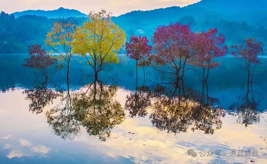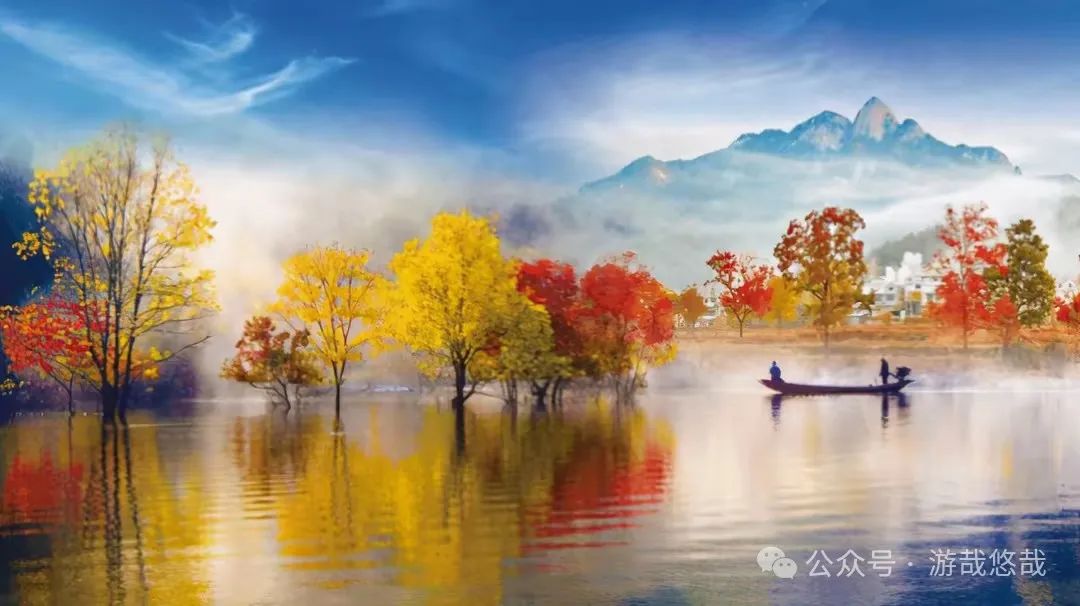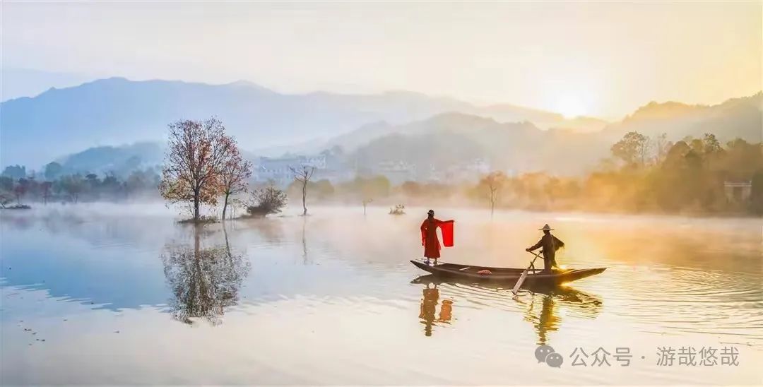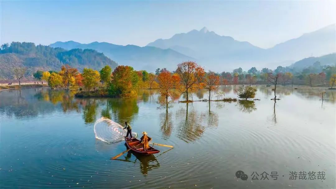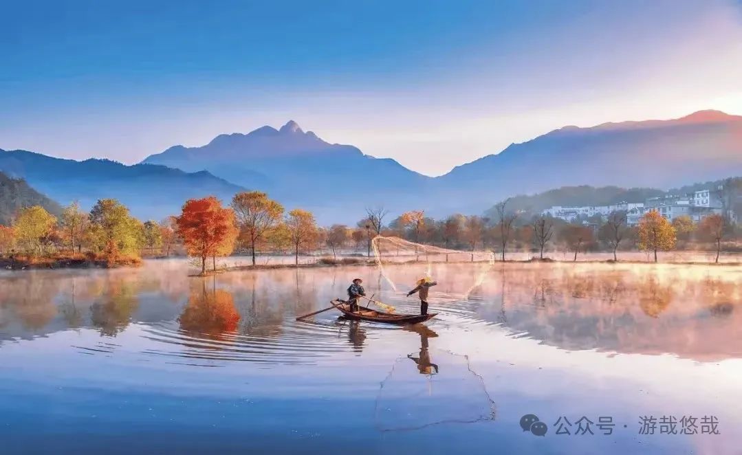 清晨,雾从山那头升起,在乌桕树林里弥漫开来,远山的轮廓一点一点露出真容,五彩斑斓的叶子倒影在水镜之中,村民撒网捕鱼,一幅传统的水墨丹青画轴就此展开。水面上闪烁着点点金光,给这个宁静的村庄增添了一丝生气,此时,周围的一切都显得那么宁静而美好,仿佛时间在这里停滞。