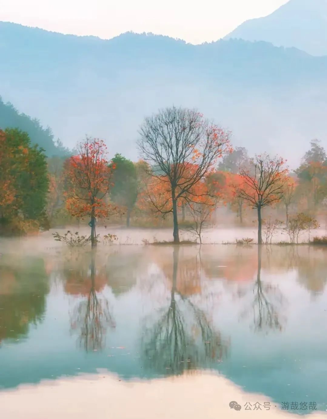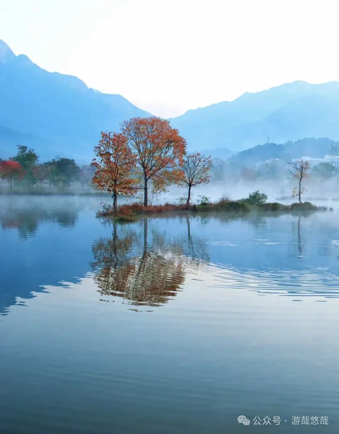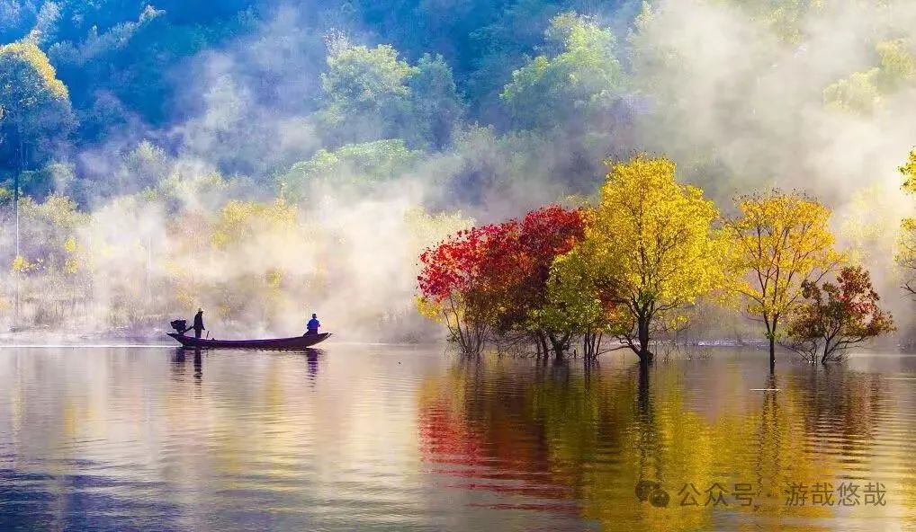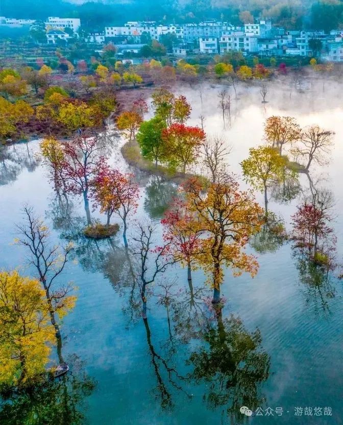 金秋时节,水库水位提升,生长于田间地头的数十棵乌桕树被水浸润,形成了惊艳的“水上红叶”。又因为早晚温差大,早上晨雾缭绕、薄如纱翼,弥漫在水面的雾气,更赋予了红叶一层神秘的色彩。