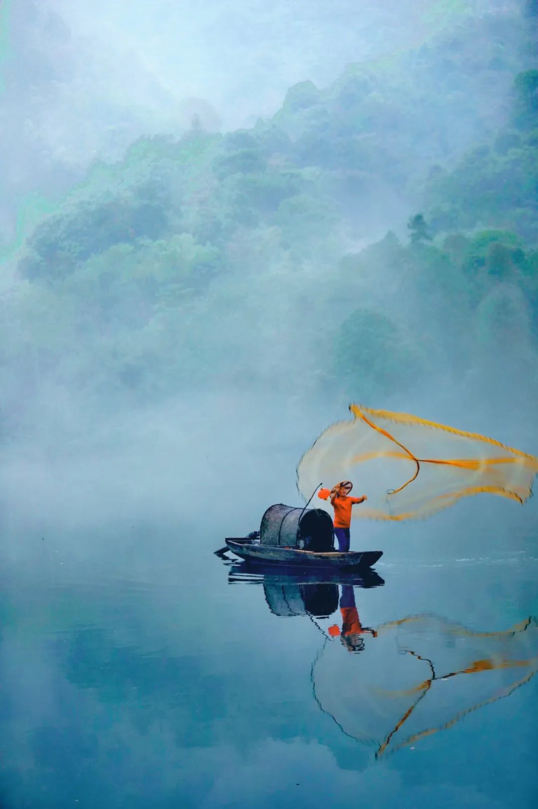 渔人撸桨划舟,喊着号子,挥手将渔网撒出,勾勒出一幅祥和的渔牧之景!