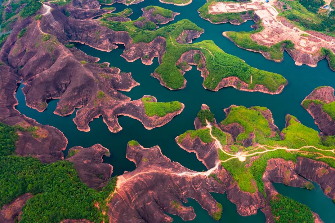 它最大的特点就是丹霞地貌周边,有漂亮的水洼点缀,用上帝的角度望下去,红岩绿水、险寨奇涧,美得一塌糊涂。