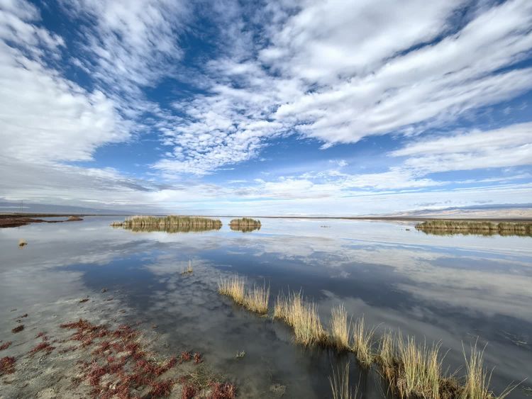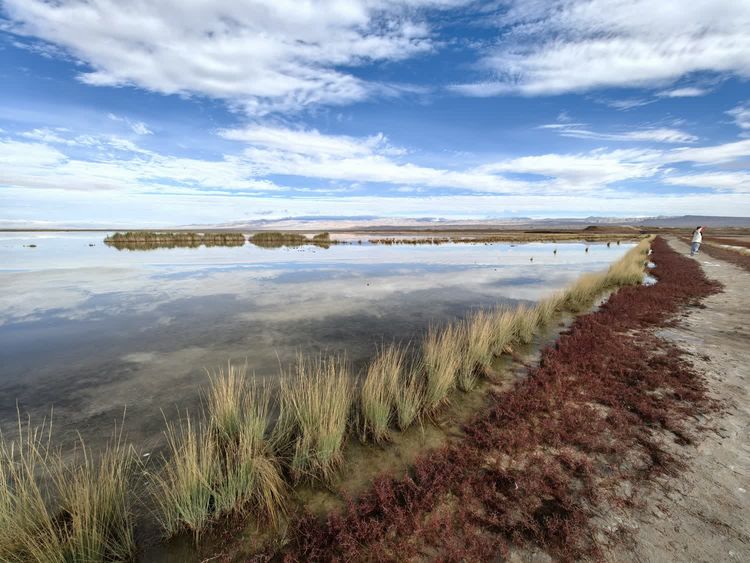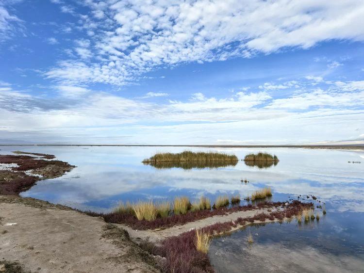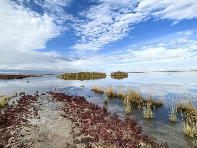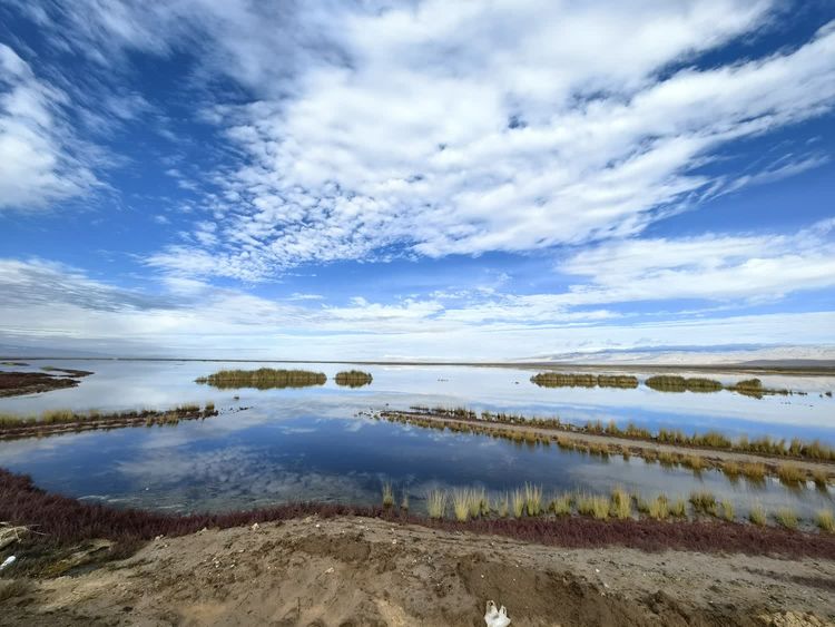 去往艾肯泉的路上,路边有一片水。远山、蓝天、白云,都倒映在水面上。一丛丛的芦苇摇曳着,水边有红色的碱蓬草。把这些景色拉入镜头,好看极了。