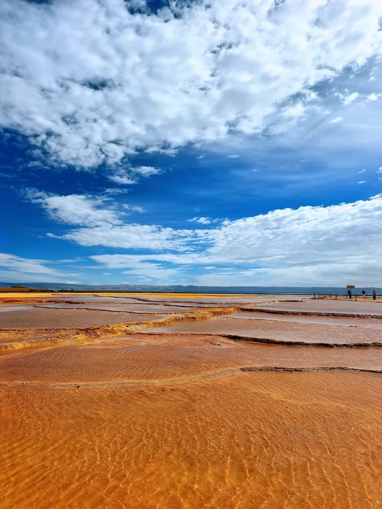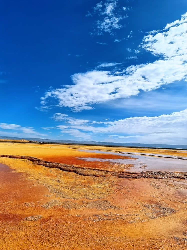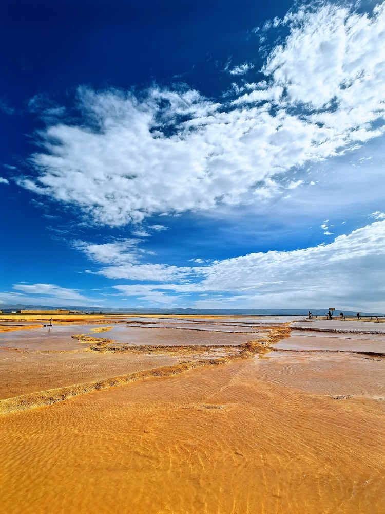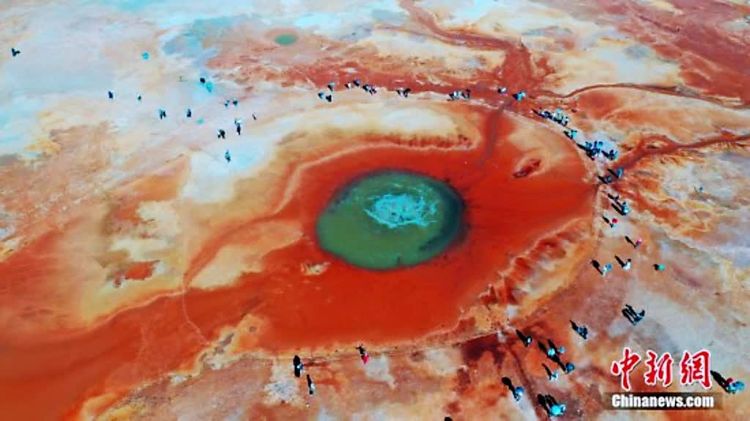 盐湖总面积约26平方公里,属硫酸镁亚型盐湖,湖中盛产锂、钾肥、芒硝等盐化物。这片大小不等、形态迥异、深浅不一的盐池中的高浓度盐水在当地称之为“卤水”,是历经多年的盐湖开采而形成的采坑。由于所含矿物质浓度的不同,呈现出不同的色彩。