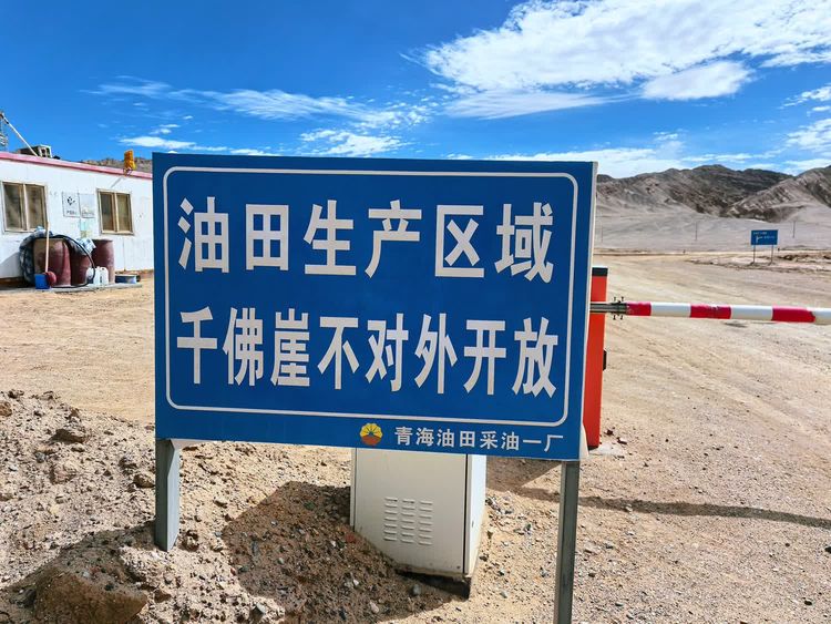 到景区附近,看到了千佛崖的旅行标牌,但被拦在了景区外。工作人员告知我们,这里是油田生产区域,千佛崖不对外开放,有些失望,开车去往翡翠湖景区。