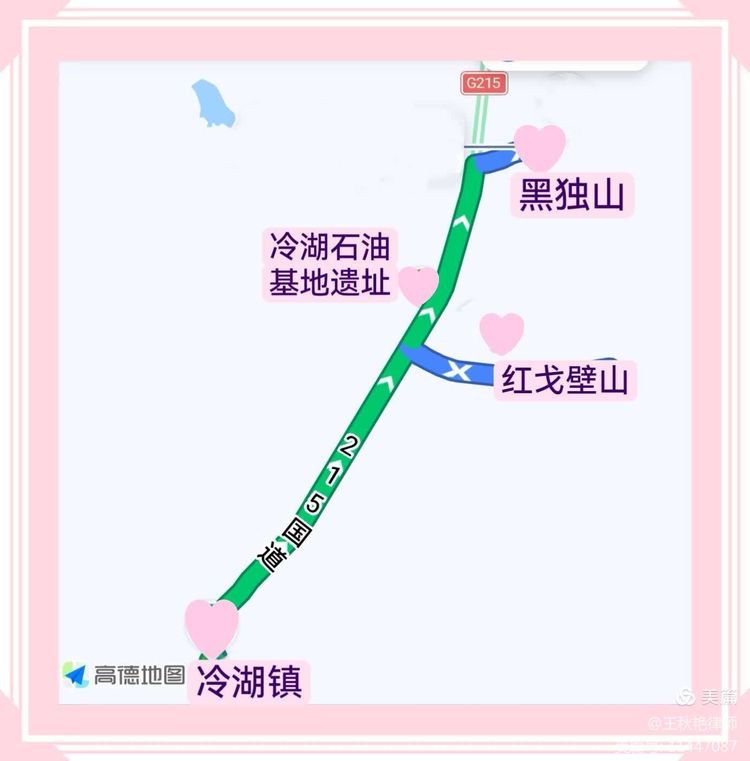 游览前,我们都习惯了先在手机上设定好导航。但昨天在高德和百度地图上找“胭脂山”,却都没有显示。扒拉着高德地图和百度地图找半天,发现了“红戈壁山”这个名字,对照之前做的攻略,地图上的“红戈璧山”,应该就是网上资料中的胭脂山了。从冷湖镇导航到红戈壁山距离约14公里,其准确位置是从冷湖镇出发向黑独山方向,在G215国道约786.6公里处,也就是在G215国道786公里处再过大约600米,向右有分叉路,沿着主路的硬车辙进去即可。