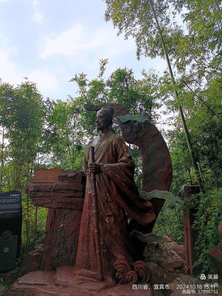 拜寿台上,我看到有一尊塑像矗立,不知何人,走近一看,原是诗圣杜甫是也。他旁边植有一些细的竹,一块牌子上介绍作“小丝琴竹”,又叫孝顺竹,著名的观赏竹。意味着杜老夫子当年在浣花溪边也少不了它的倩影吧。