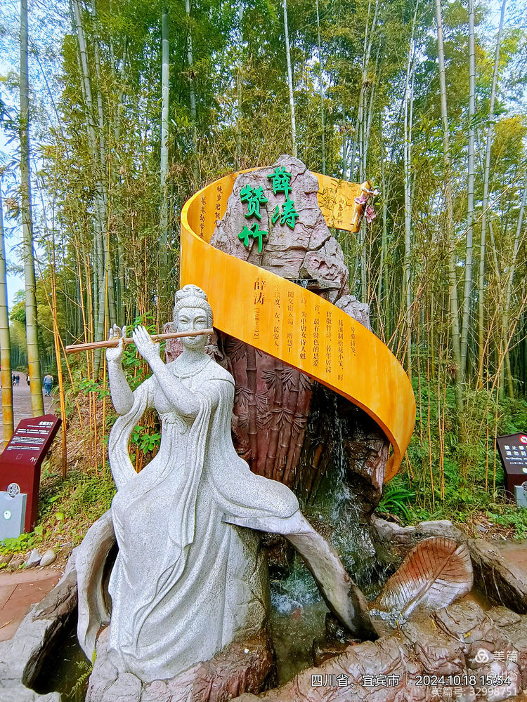 不觉间我们就来到一位持丝竹之美女身边:她原是一尊石雕“薛涛赞竹”。便有幸识得中唐时一位女诗人魁首薛涛,字洪渡,长安人,辨慧工诗,其爱竹敬竹诗最有名。晚年于成都浣花溪边制松花小笺,号薛涛笺。又见大诗人白居易《养竹记》。