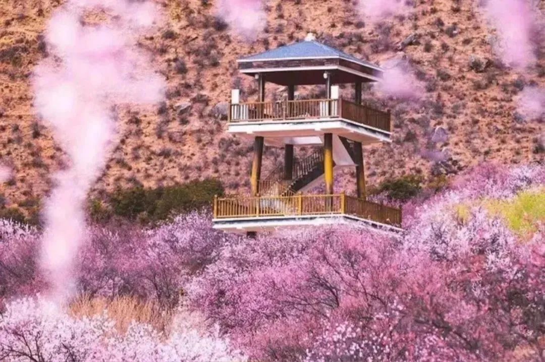 朵当村这里有3300多株树龄百年以上的野桃树,桃花盛开缤纷绚烂,与当地群众种植的翠绿冬小麦相映成趣、春色宜人,这里的桃花是开得最美丽最广阔的。