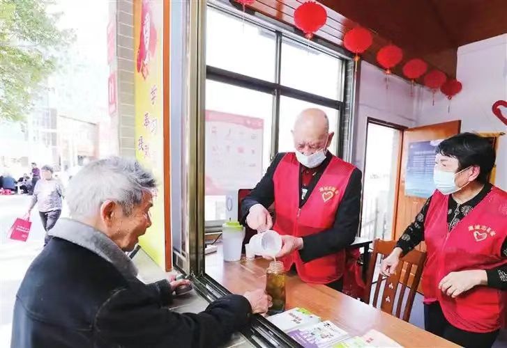 刘慧芝还经常出现在社区的养老助餐点,维持打饭秩序,帮助行动不便的老人找座位。