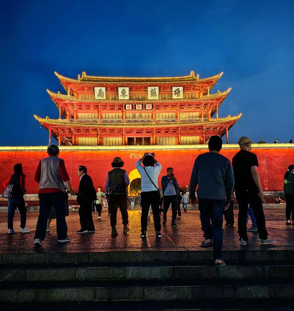 是夜吃完烧烤,我们来到朝阳楼看夜景,并登上了城楼。朝阳楼是建水的地标性建筑和城市名片,有点小天安门的味道。它始建于明朝洪武年间,历经六百多年的风雨洗礼,依旧巍峨挺拔,气势非凡。城楼飞檐斗拱,雕梁画栋,造型精美,极具艺术价值。买票登楼,视野瞬间开阔,古城的全貌尽收眼底。青瓦白墙的民居错落有致,街巷中行人穿梭,烟火气息扑面而来。