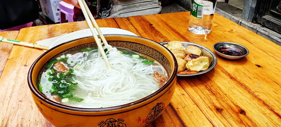 我们在紫陶街吃了建水烧豆腐,它的特点是闻起来臭,吃起来香,炭火烤制,外焦里嫩,松软劲道,搭配蘸料,口感独特,别具风味。还有草芽米线,汤鲜味美,口感极佳。还有燕窝酥,色泽洁白,层次清晰,酥香可口。坐在窄巷里,身边都是陌生人,听南腔北调的话,吃美食,闻菜香,看漂亮的姑娘,心情无比的轻松和愉悦。