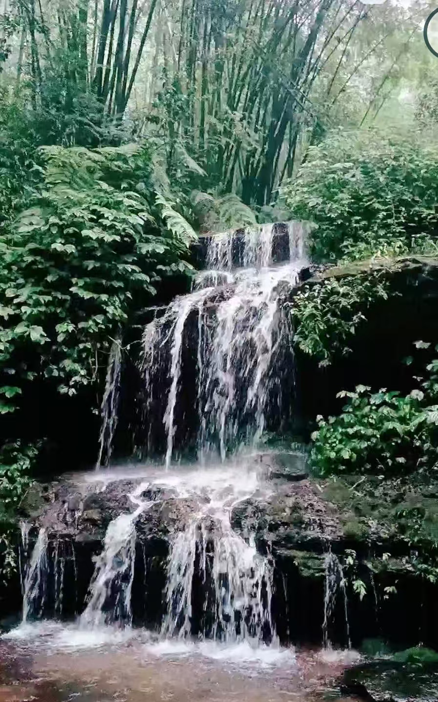 最受看的是“五叠屏”,流水不知从何而来,却从五级台阶跌落而下,形如一条白练肆意飘扬,但我的镜头里只能看到三级——欲穷五叠屏,更上一层楼啊!林深不知处,只能沿左侧茂密竹林间时而阶道时而坦路踽踽而上了。这时妻已与我各走一道,不担心她走失,我只管照着自己的感觉走——向上走,走着走着竟然走上一条只我一人在走的路。路上景色已是美不胜收,修竹万竿,密密匝匝,滴翠可人,拍照已不能表我心意,只好大段将它们录了下来。当走到再也不能向前走时,形似《西游记》里的水帘洞出现在眼帘,便欣然收录在手机。这时的我确实也进入了忘忧之境。待我录下“水帘洞”时,妻来电话说,她看到“竹林七贤”了。