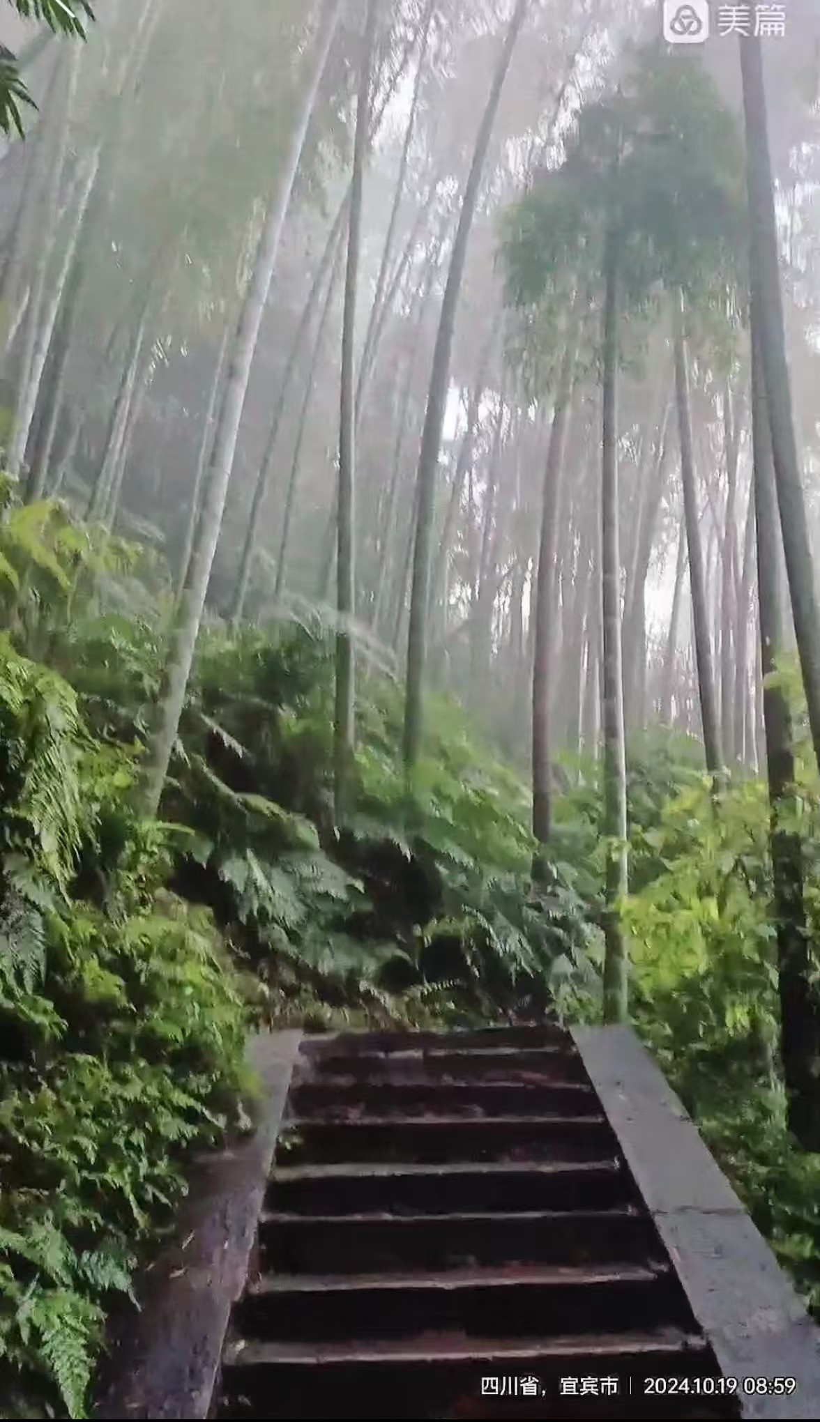 在承宾楼四楼一间屋子里,我们在哗啦啦的流水声陪伴下度过一个更显宁静的夜晚。听的哥说,竹海这里今年一个夏天到秋天没怎么下雨,也许是我们的到来,感动了上天——十九日七时许,当我们下楼走出门时,即见门口路面已成湿润,“润物细无声”,如蚕丝般细雨静悄悄地漂落着。