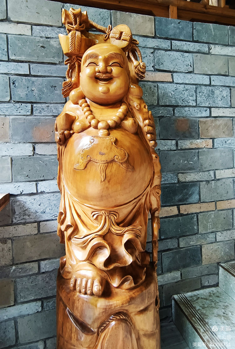 会过竹林七贤,我们继续往下走到停车场去。一路有美女丝竹之声相陪,确实让人把生活中的忧怨忘却也。在停车场边一家竹特产超市,妻一下子买了六百多元竹耳、竹笋、竹荪等一大堆竹产品——其中还有引我中意的一筒竹筒酒(在基本成熟的竹的两个竹节之间注入酒水,三至五年后截取饮用)、一盒竹尖茶。看着超市走道里木雕和尚头笑呵呵地样子,禁不住也让我给拍了下来。