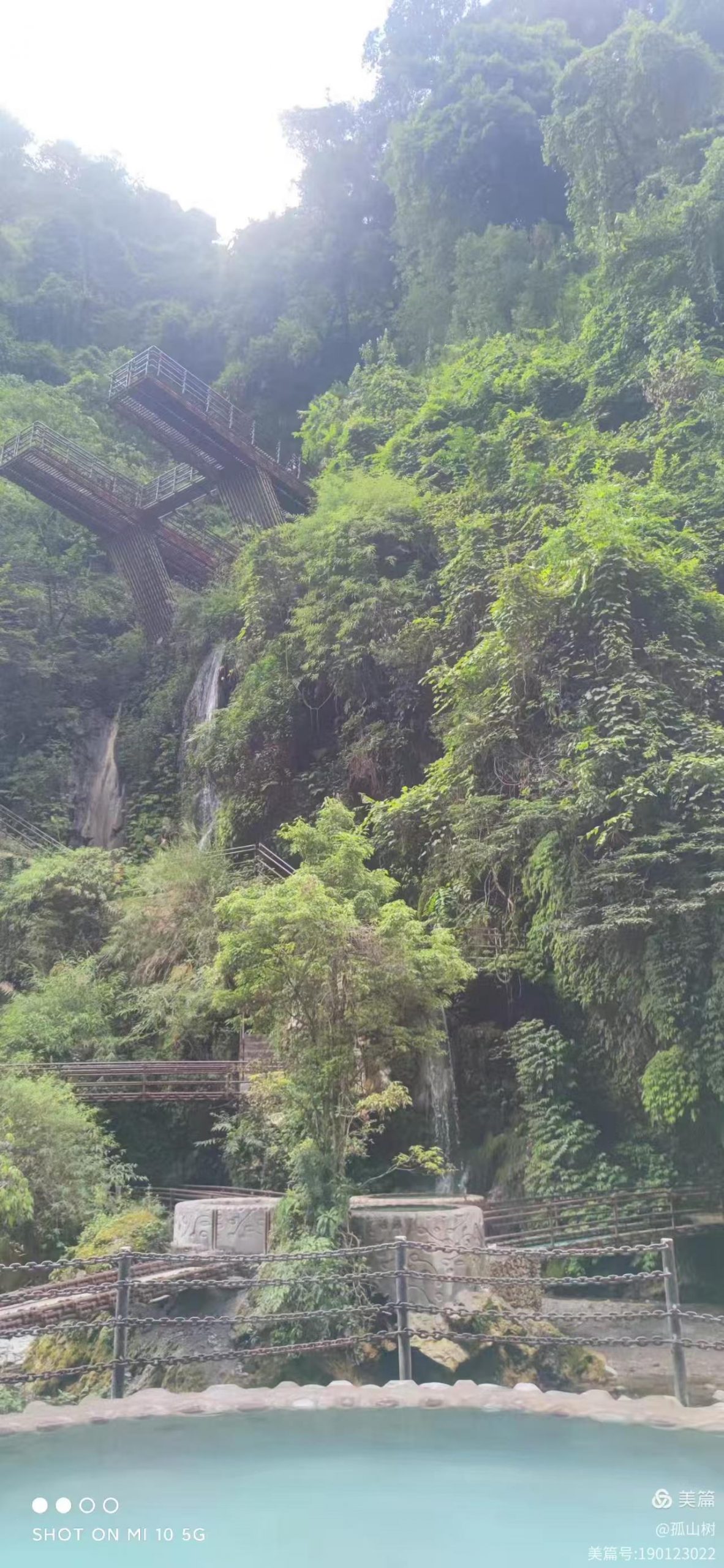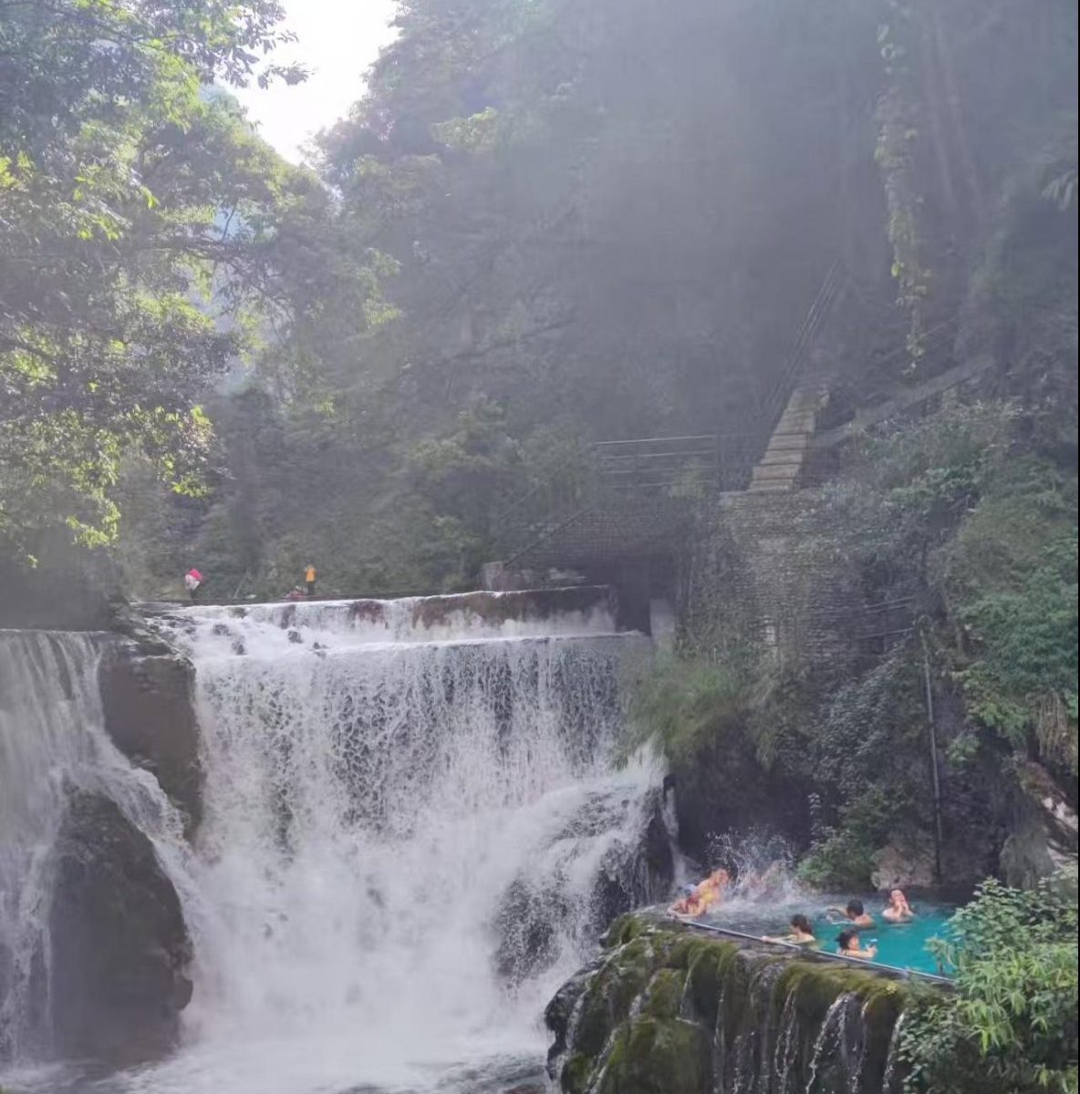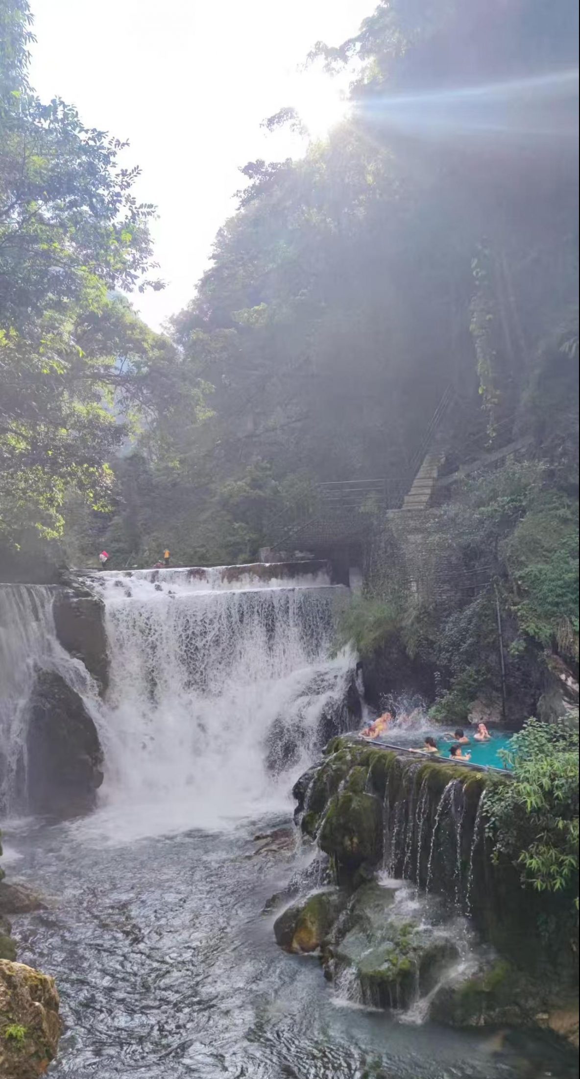 螺髻山温泉瀑布现在也是网红热点,游客非常多。一路上听见有的游客抱怨,没有泡成温泉,人太多无法下池,又不愿去挤。我们到时己是下午4点多钟,游人多己离去,所以有缝隙可以下去。而且人越来越少,活动空间渐大。