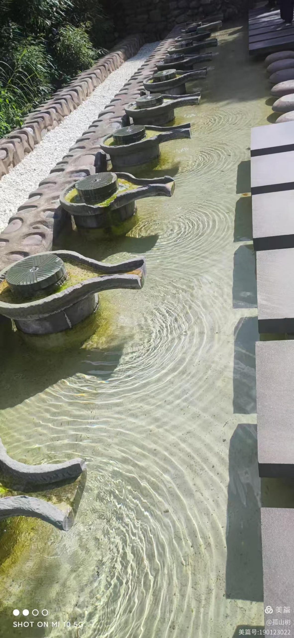 他们走后,池里空旷许多,请一位游客帮我们拍像,她建议拍了一张撩水的照片。