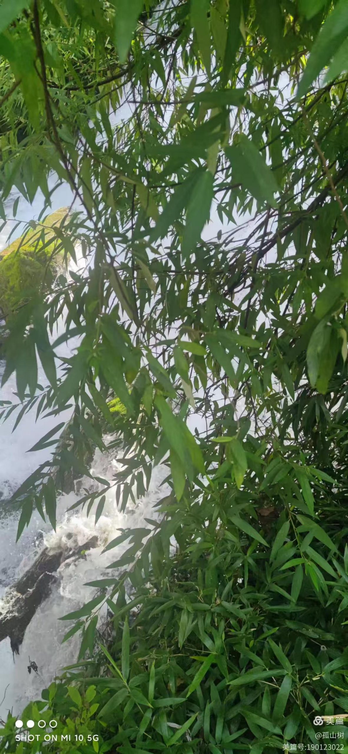 绿叶后面是瀑布,奔流而下,声音响亮。据说螺髻山雪水融化后在温泉瀑布上游50米处形成一个活水湖,该水四季冰凉剌骨,而温泉水仿佛是地底下的水煮沸腾了,喷涌而出,形成六个小岛,岛上可泡温泉。岛内还有洞穴温泉,水火在这里相融,大自然和谐地、安㴵地流淌在群山环抱之中。