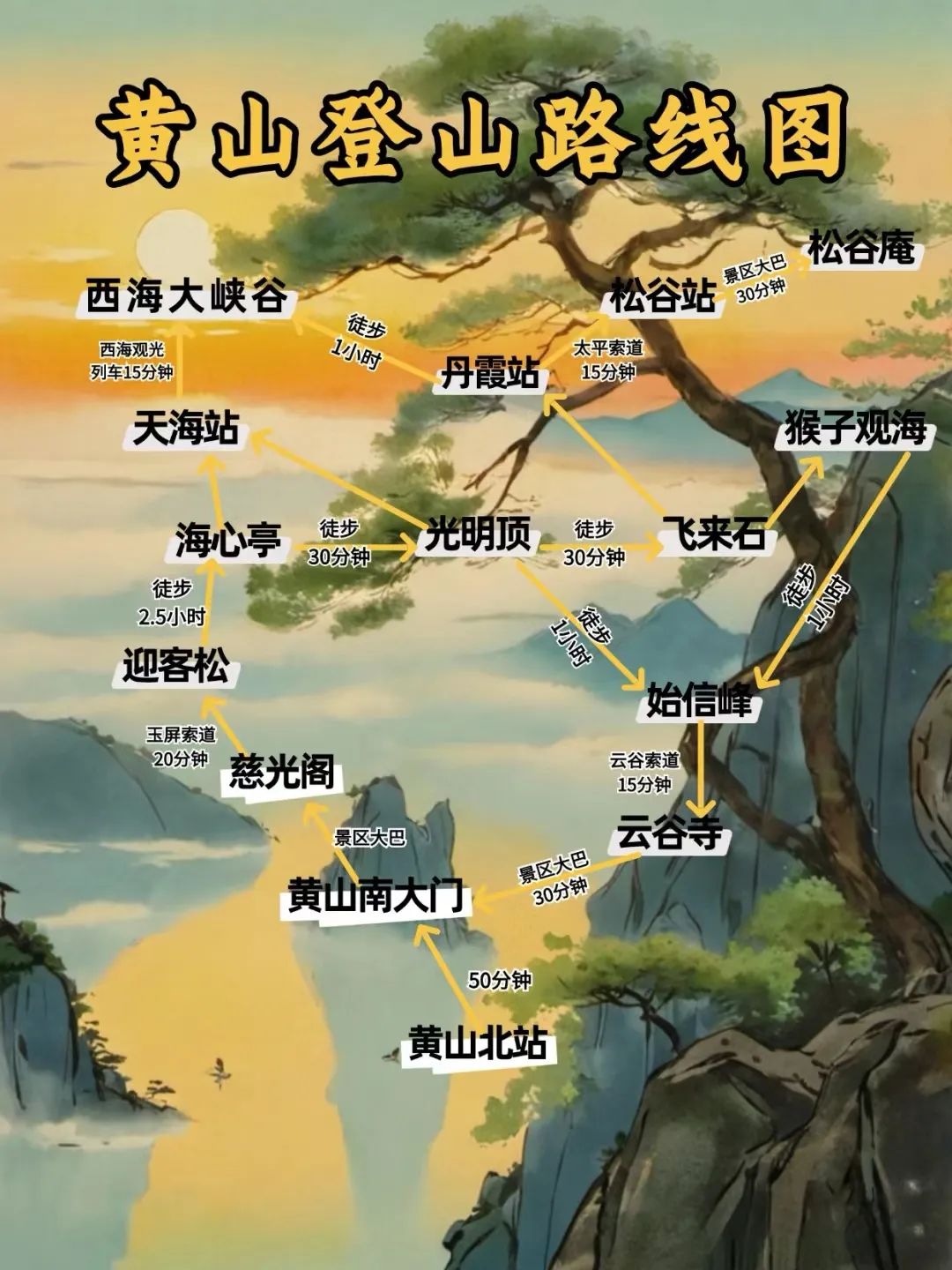 玉屏索道(上山) — 迎客松 — 百步云梯 — 鳌鱼峰 — 光明顶 — 丹霞峰 — 清凉台 — 狮子峰 — 黑虎松 — 梦笔生花 — 始信峰 — 云谷索道(下山)