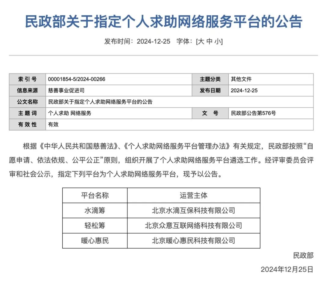 民政部发布公告指定3家个人求助网络服务平台,分别是: