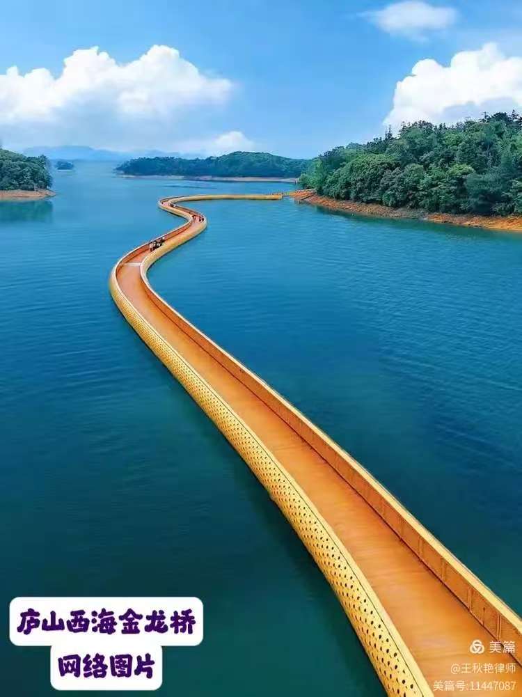 庐山西海风景区中,金龙桥是一座极具特色的桥梁。这座桥因其弯曲的形状和桥身的颜色而被称为“金龙桥”,桥长约500米,仿佛一条黄色巨龙盘踞在碧蓝色的湖面上,蔚为壮观。