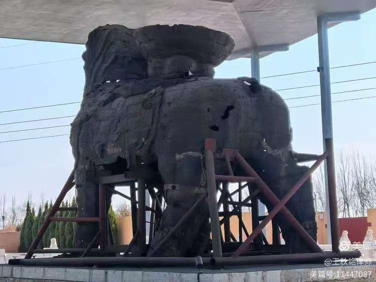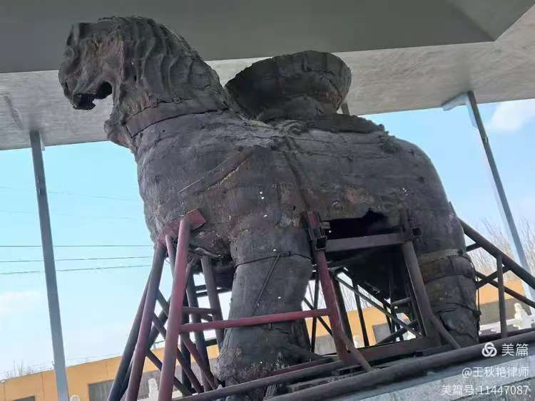 真正面对这尊千岁高龄的铁狮子时,不禁一声叹息:狮身锈蚀严重,肚皮破损,身上可见多处破洞,脖子处一圈儿裂痕,下巴不见了,腮帮子缺了一块,尾巴也不知道去了哪里。尤其是四肢断裂疏松,只能依靠铁架支撑了。