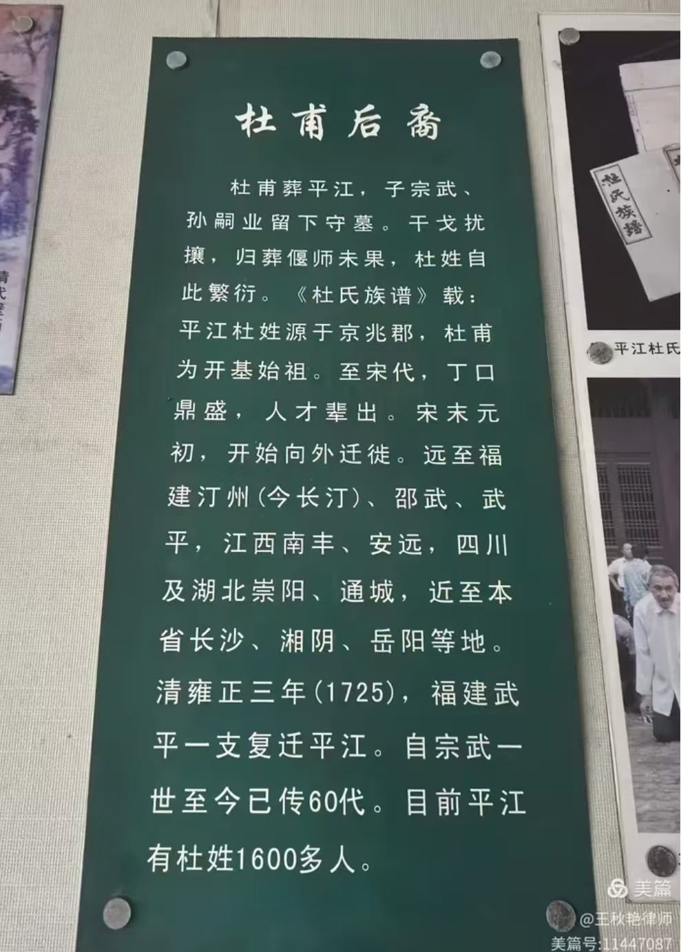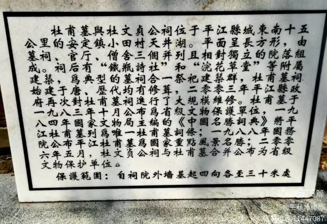 可惜的是,杜甫死后,儿子宗武无力葬父,只好为他在小田立下了墓,具体位置就在湖南省岳阳市平江县小田村天井湖。杜甫的后代也从此定居于平江,现在小田村共有2000多名杜氏人士。