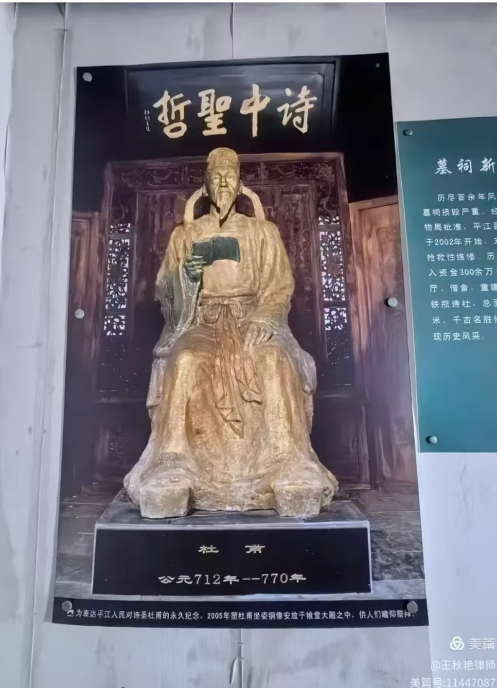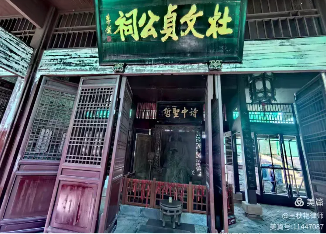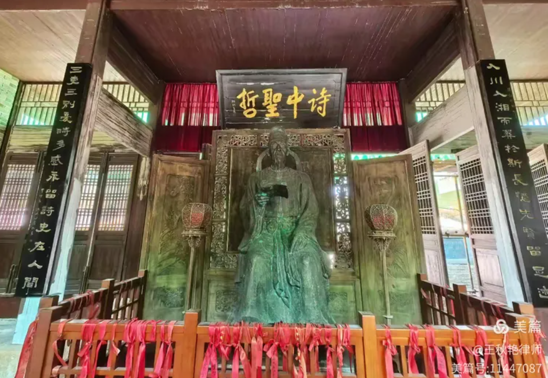 祠内是杜甫的坐姿铜像,2005年落成。牌匾上书“诗中圣哲”。