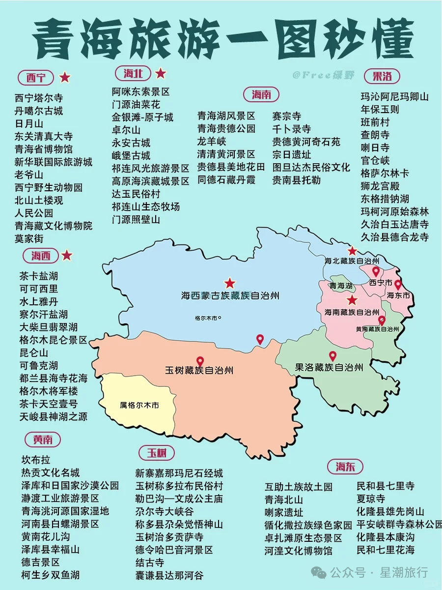 ✅精华景点:青海湖、茶卡盐湖、塔尔寺、祁连山、门源油菜花海、格尔木昆仑山口、德令哈外星人遗址、玉树可可西里、黄南州同仁市、果洛州玛多县。
