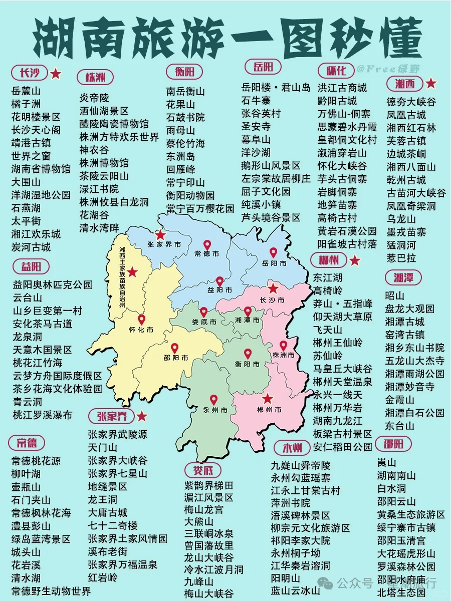 ✅精华景点:张家界国家森林公园、凤凰古城、南岳衡山、岳阳楼、长沙岳麓山、韶山、常德桃花源、永州柳子街、郴州东江湖、株洲炎帝陵。