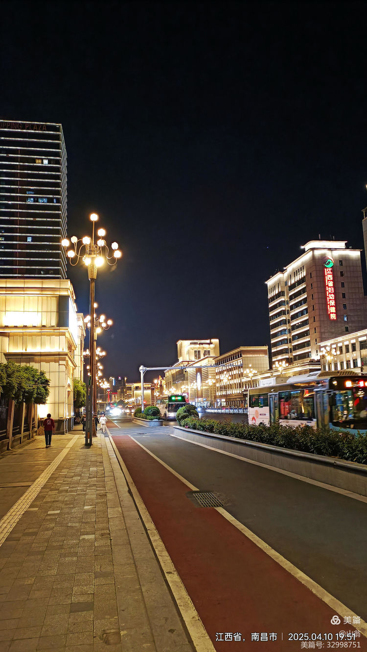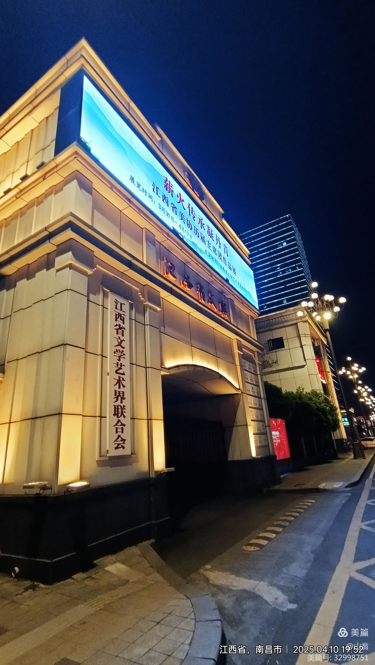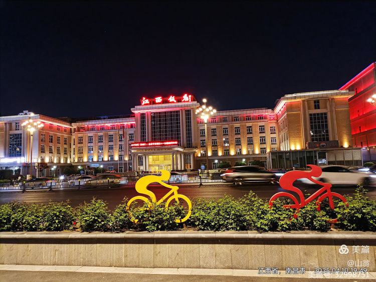 当我们左转行进时,已与我们走过的这条正在修缮的街道形成鲜明对比,路面平整光亮,两侧建筑物灯彩通明,江西饭店、江西省妇幼保健院、江西省文学艺术界联合会等单位,都一一向我们报到。远远地看着路的右侧,有一座形似北京人民大会堂的建筑,鲜艳的五星光彩熠熠,我想那该是广场的中心了吧。