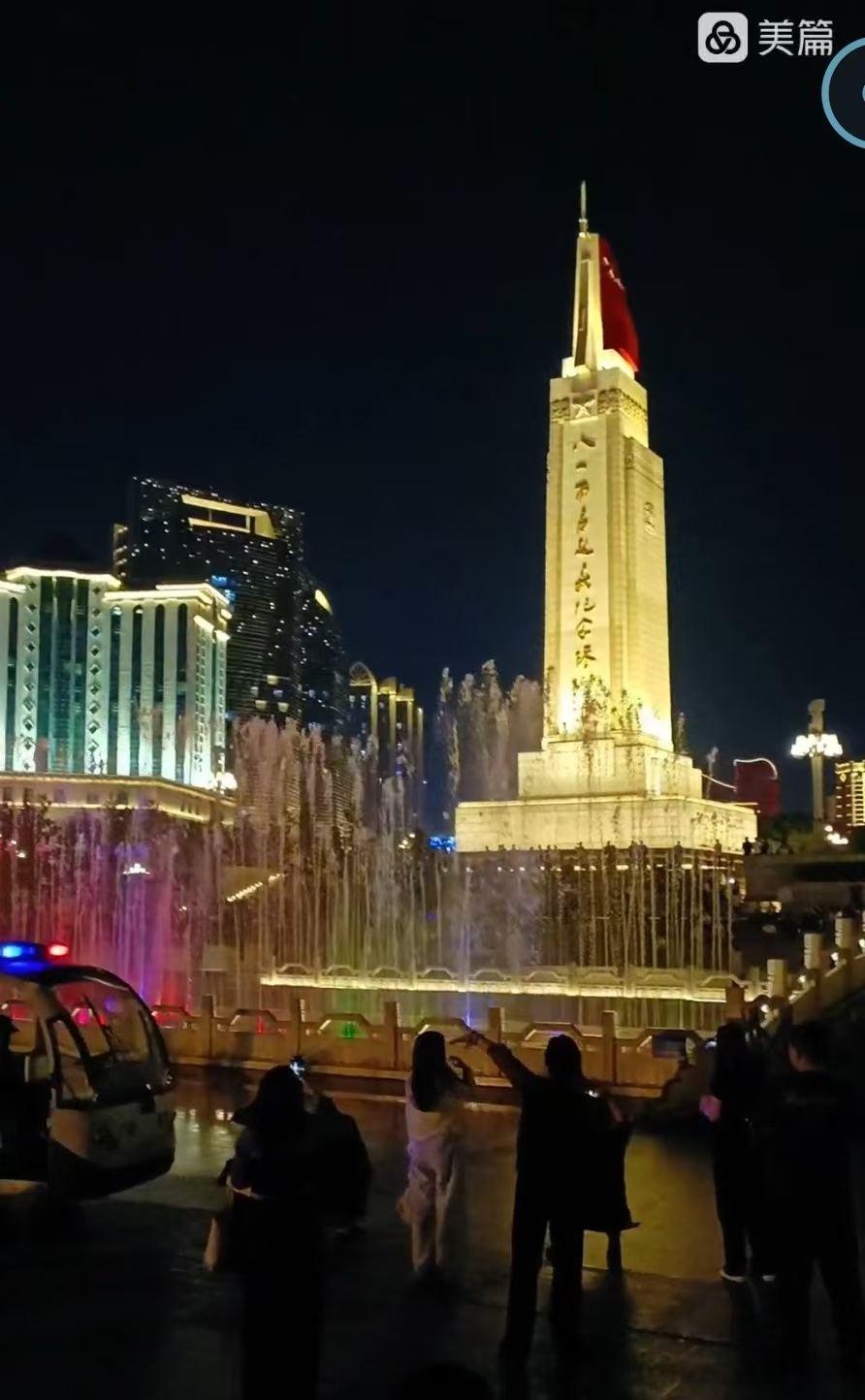 (SP:音乐喷泉环绕着的八一南昌起义纪念塔)